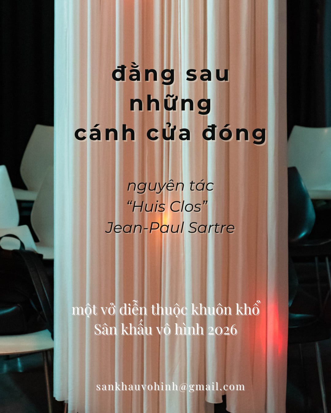 Vở diễn đầu tiên, chắc chắn là vở diễn mà các bạn đang mong chờ: “Đằng sau những cánh cửa đóng”, từ kịch bản gốc Huis Clos của triết gia Jean-Paul Sartre.