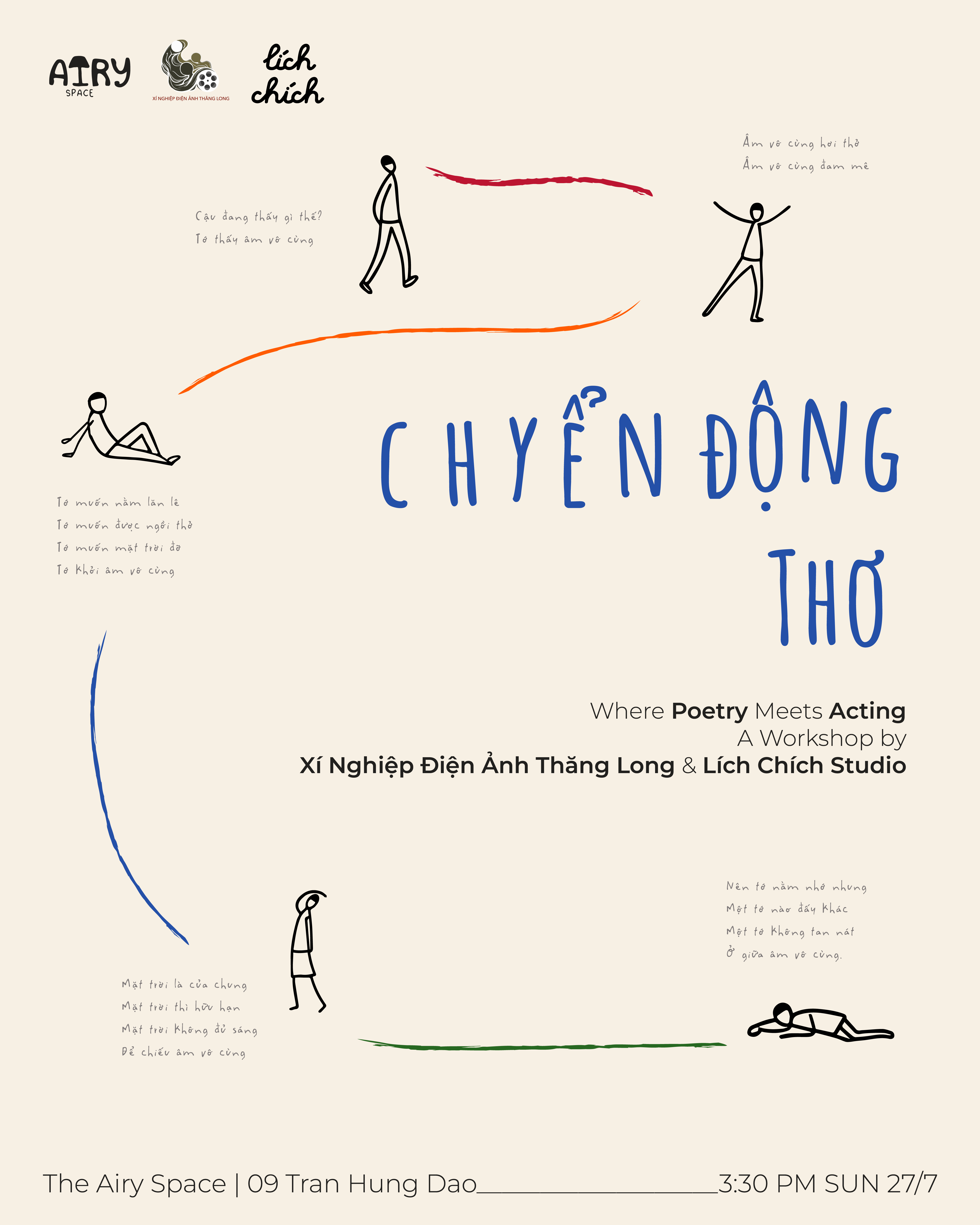 Workshop chuyển động - thơ của Xí Nghiệp, kết hợp với Lích chích tại The Airy Space là một chương trình đưa người tham gia trở về với hai hình thức sáng tạo cơ bản của con người: viết và chuyển động. Gọi là cơ bản, bởi bạn không cần đến những thiết bị phức tạp hơn, như nhạc cụ hay máy ghi hình, mà chỉ cần đến một chiếc bút, và chính cơ thể mình.